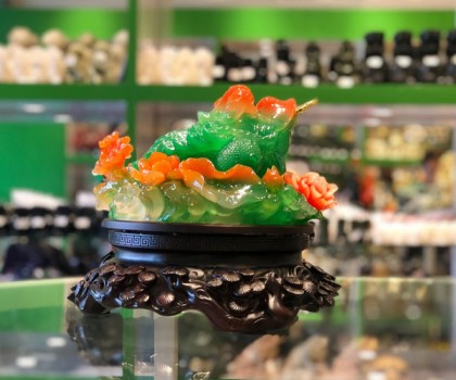 + Chất liệu và hoàn thiện: Thiềm thừ (cóc ba chân) xanh trên đảo hoa mẫu đơn, có đế gỗ, bột đá màu cao cấp (tại Việt Nam).